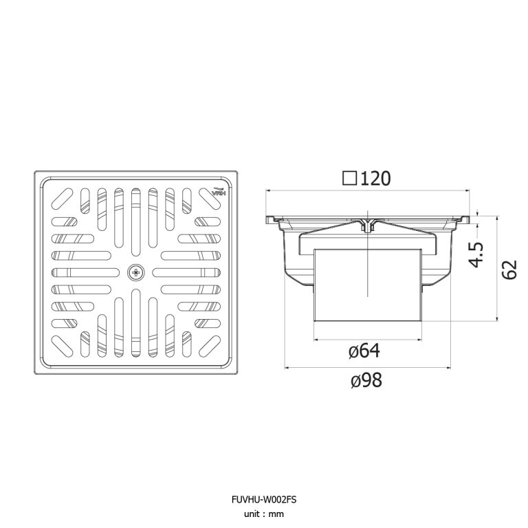 ตะแกรงกันกลิ่นทรงสี่เหลี่ยม 4.8″ฝาเหลี่ยมท่อขนาด 2.1/2″ อัตราการระบายน้ำ27ลิตร/นาที