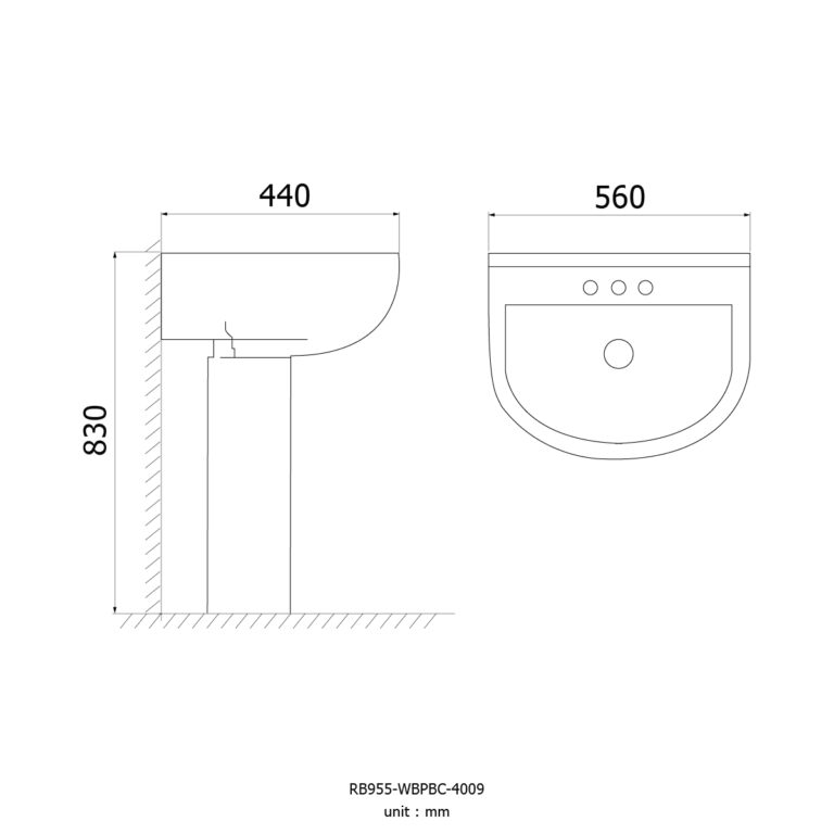 อ่างล่างหน้าแขวนผนัง พร้อมขาตั้ง มีรูก๊อกและรูน้ำล้น รุ่น 4009C (4009A-Basin + 4009B-Pedestal)